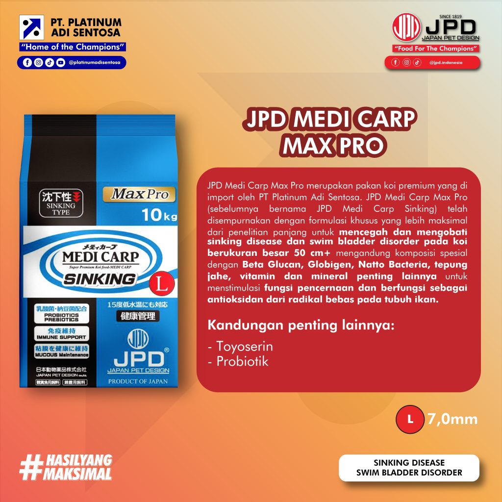 Sinking disease dan swim bladder disorder merupakan masalah kesehatan umum yang sering dihadapi pemilik koi, terutama pada ikan berukuran besar di atas 50 cm. Gejala awal swim bladder disorder ditandai dengan koi yang sering meneguk udara ke permukaan (gulping), dan pada tahap ini Anda harus menggunakan JPD Medi Carp Max Pro tipe floating 100% selama 5-10 hari. Apabila kondisi berlanjut menjadi sinking disease dimana koi parkir di dasar kolam dan muncul bercak merah, gunakan JPD Medi Carp Max Pro tipe sinking 100% selama 7-14 hari.