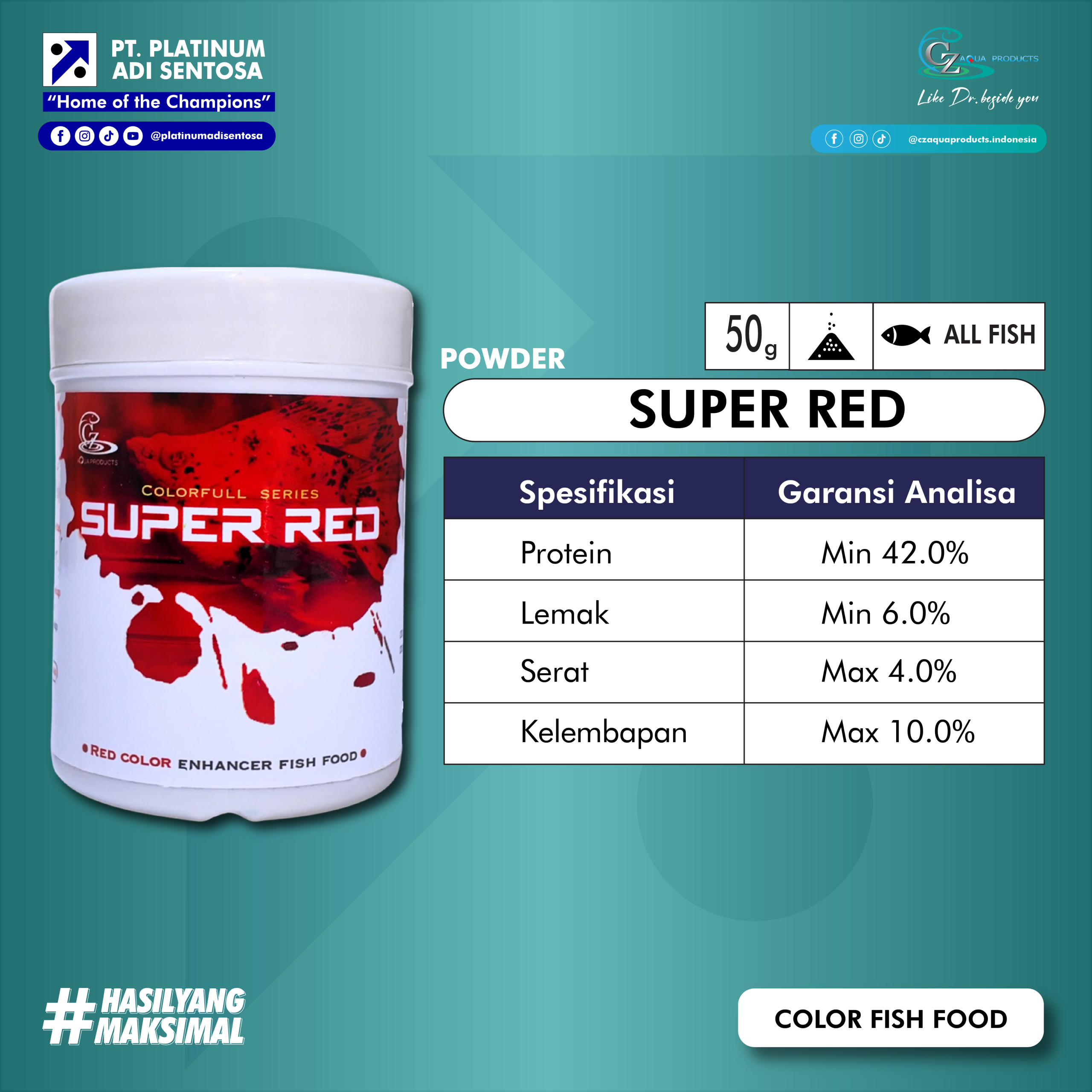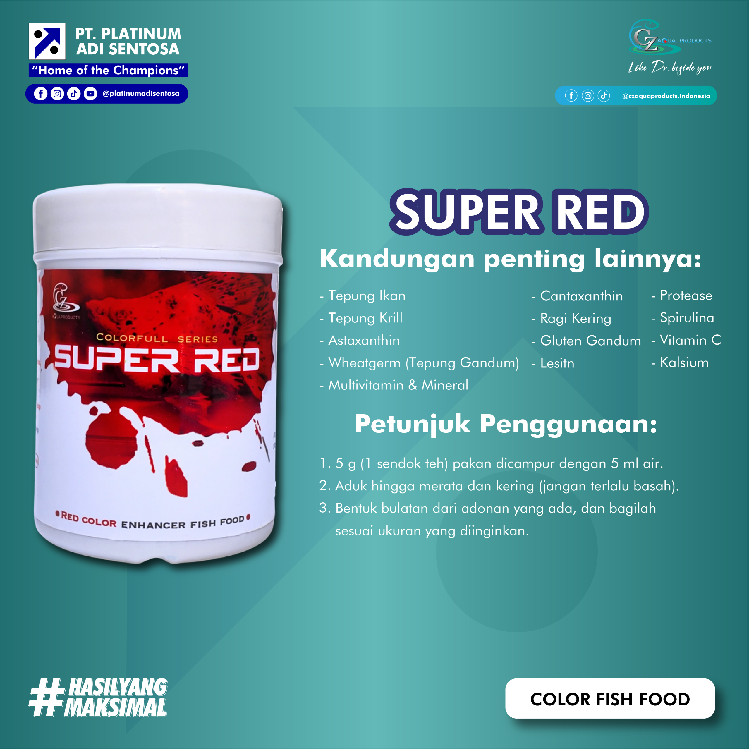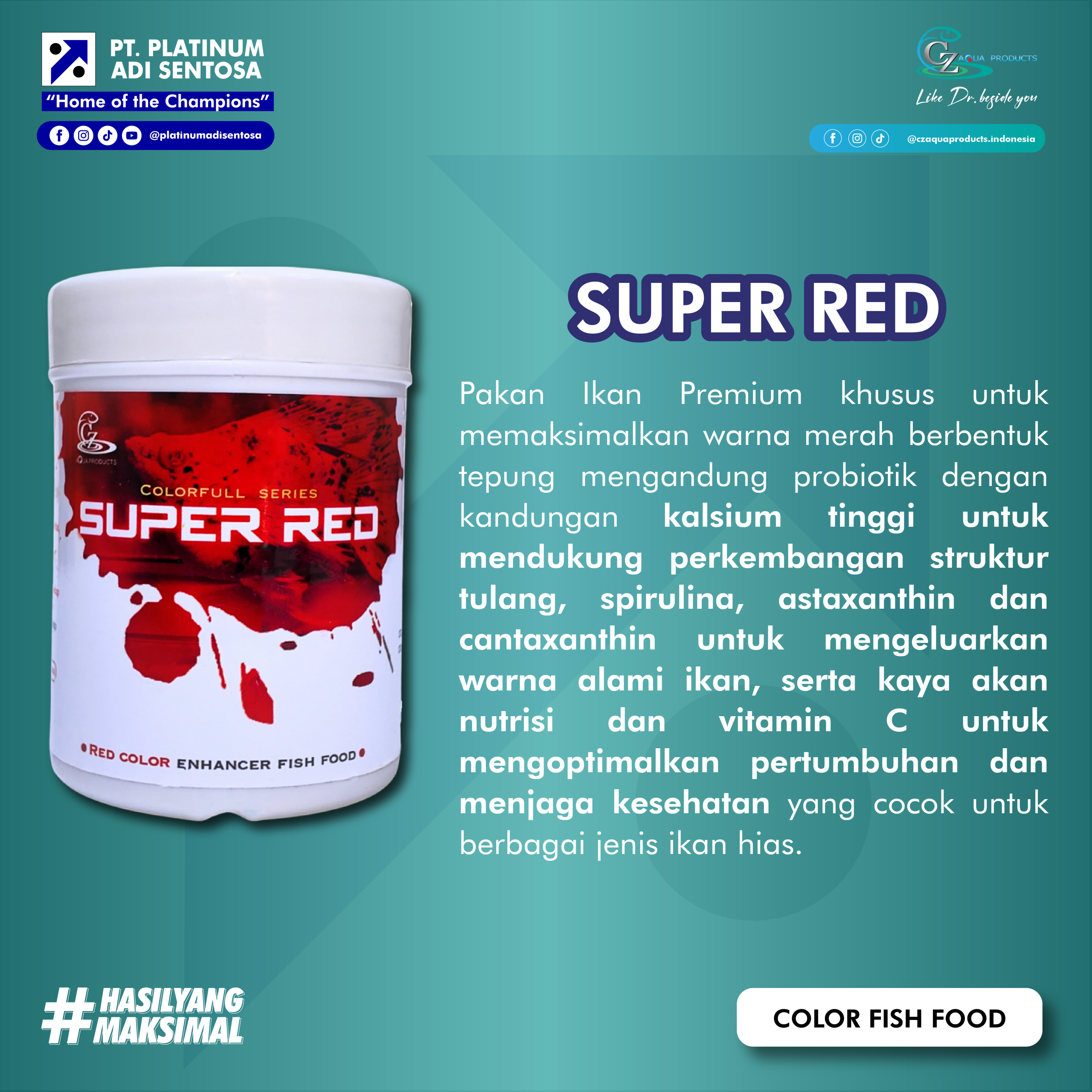CZ Super Red adalah Pakan Ikan Premium khusus untuk memaksimalkan warna merah berbentuk tepung mengandung probiotik dengan kandungan kalsium tinggi untuk mendukung perkembangan struktur tulang, spirulina, astaxanthin dan cantaxanthin untuk mengeluarkan warna alami ikan, serta kaya akan nutrisi dan vitamin C untuk mengoptimalkan pertumbuhan dan menjaga kesehatan yang cocok untuk berbagai jenis ikan hias.